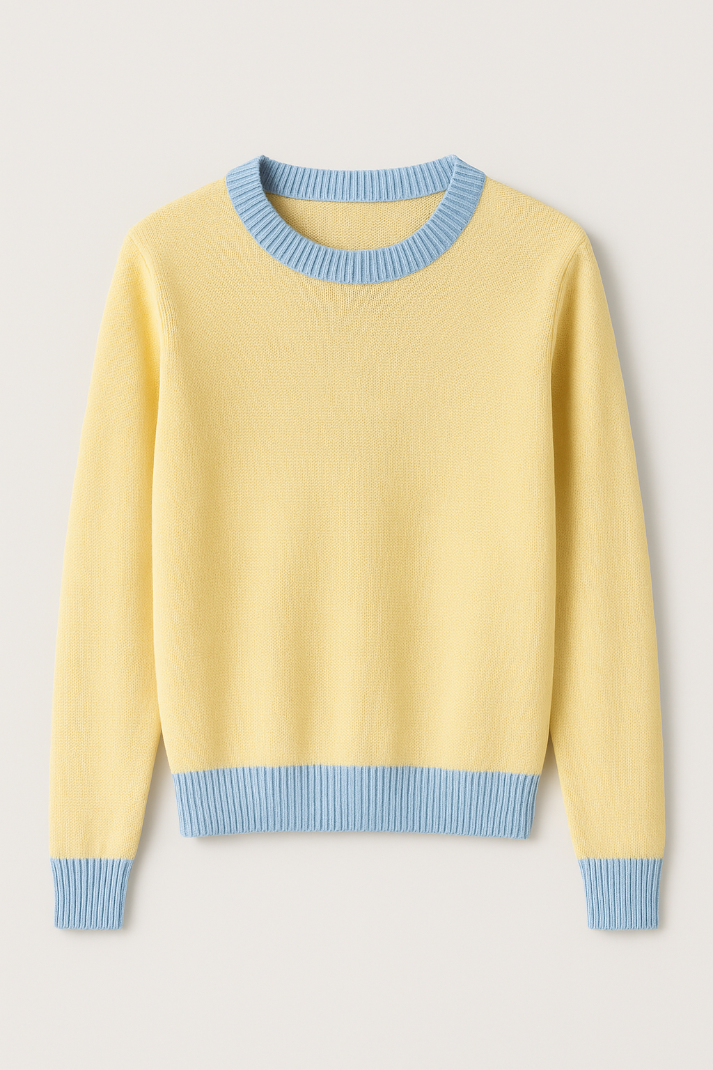 Este encantador suéter de mujer es una prenda perfecta para añadir un toque de frescura y dulzura a tu look. Está confeccionado en un tejido de punto suave y ligero, ideal para entretiempo. Su diseño en tono amarillo pastel se realza con elegantes ribetes en azul celeste en el cuello, puños y bajo, creando un contraste delicado y moderno.