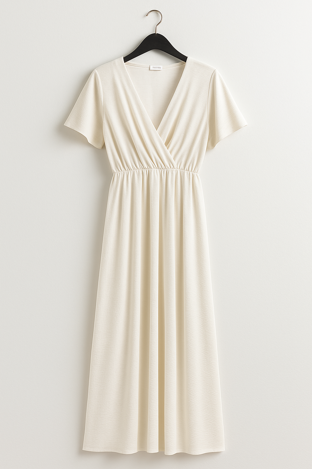 Vestido largo de diseño elegante con escote cruzado en "V" que estiliza la silueta. Su cintura elástica marca suavemente la figura, mientras que las mangas cortas de corte fluido aportan comodidad y frescura. Confeccionado en una tela ligera de textura sutil que cae con movimiento natural, es ideal para ocasiones casuales o eventos especiales. Su diseño atemporal y versátil lo convierte en una prenda imprescindible para cualquier guardarropa.