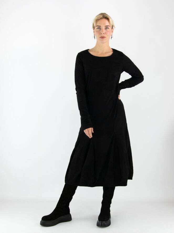 La tela tiene una estructura de canalé muy fina con pequeños puntos aterciopelados repartidos por todo el vestido.