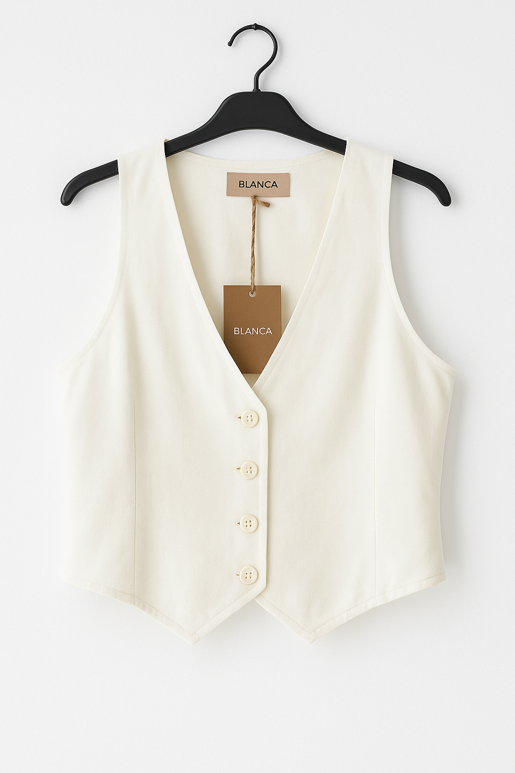 Este chaleco sin mangas de la marca BLANCA está elaborado en una tela suave de acabado satinado que realza su elegancia. Con escote en "V", corte entallado y botones frontales al tono, es una prenda sofisticada perfecta para usar sola o como complemento en capas. El diseño con terminación en pico aporta un detalle moderno y femenino.