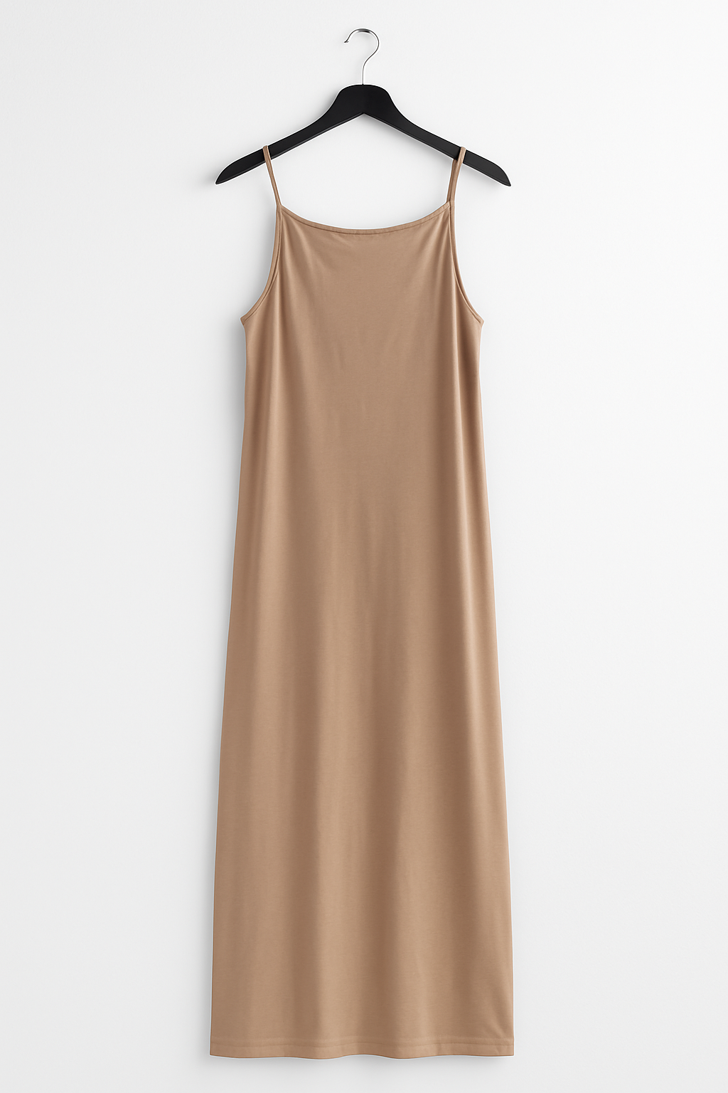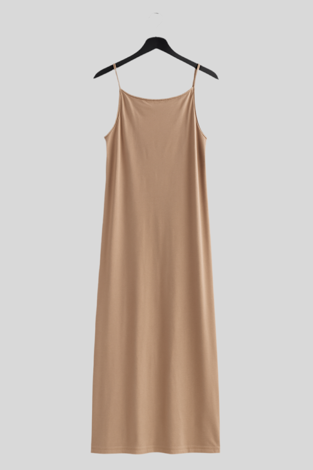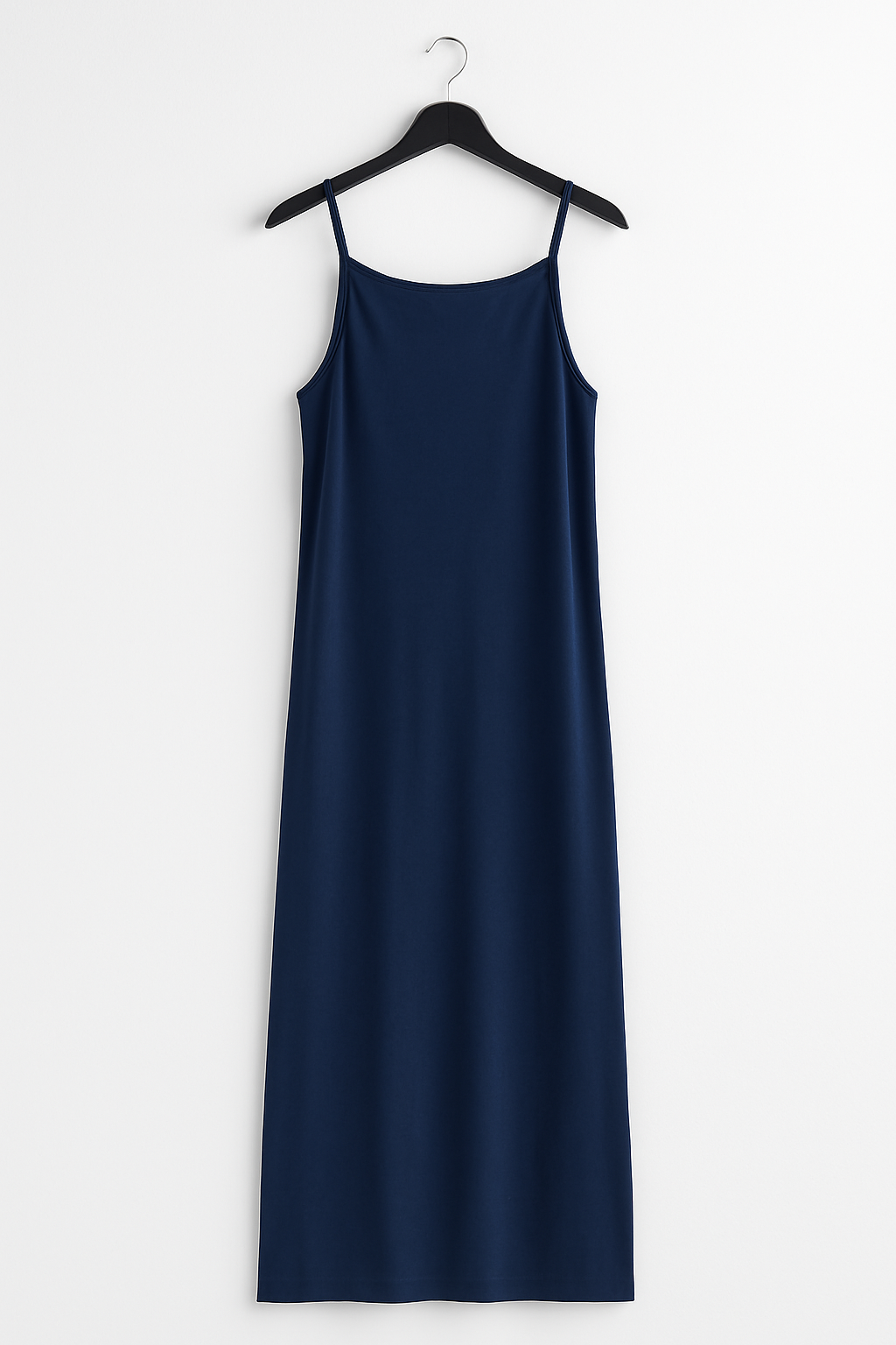Este vestido largo en color azul marino o beige, aporta elegancia con simplicidad. Su silueta relajada y tirantes finos hacen que sea cómodo y favorecedor. Perfecto para una salida nocturna o una ocasión especial, su tono oscuro realza cualquier accesorio o calzado que elijas.