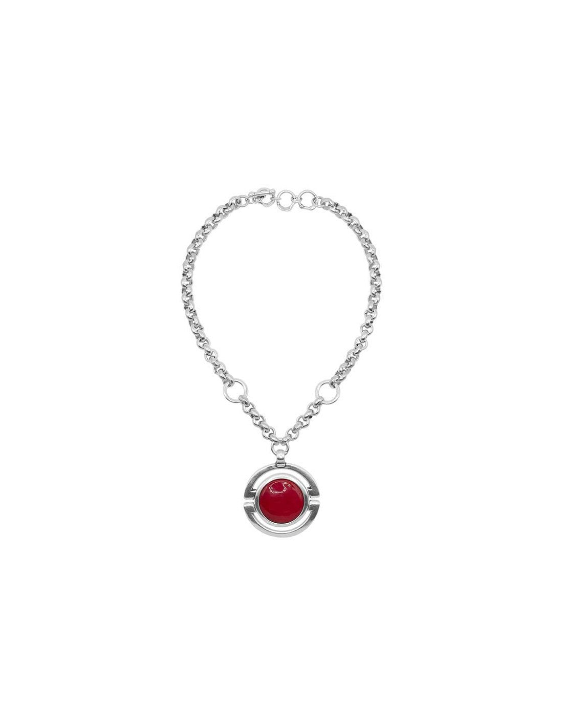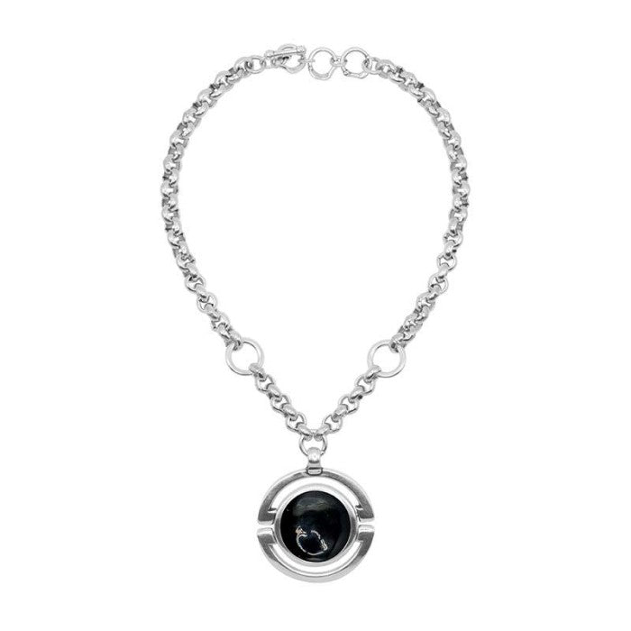 Collar corto Magnifica bañado en plata de la colección New Cocco de Ciclón inspirada en la icónica diseñadora de moda Cocó Chanel. Cocó Chanel. Diseño con colgante decorado con esfera de 50 mm en el centro montado sobre cadena de eslabones de 40 a 43 cm. Disponible en 5 colores. Cierre de mosquetón.
