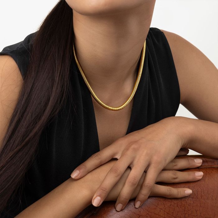 Collar de latón, modelo serpiente, de textura redonda. Cierre regulable con mosquetón. Producto sometido a pruebas de níquel. Fabricación artesanal.