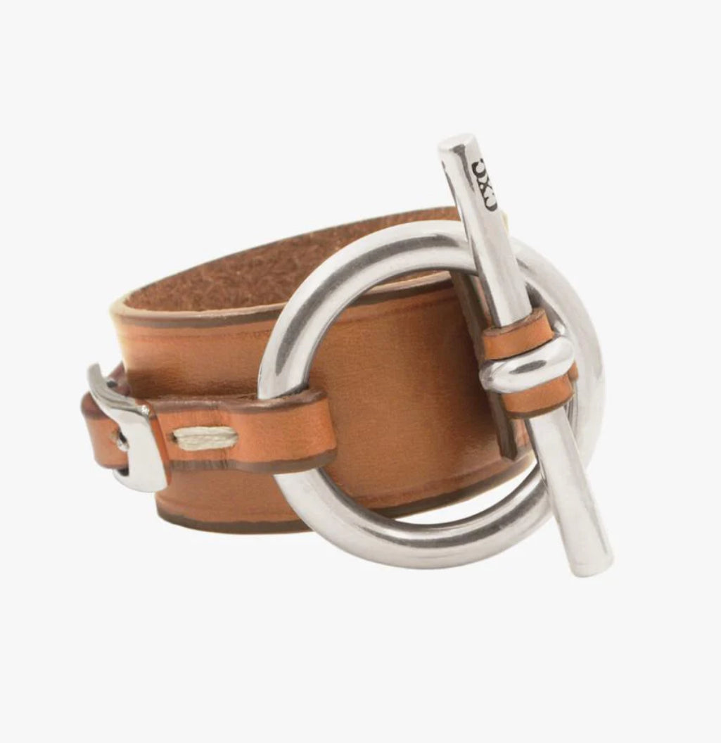 Este brazalete se diferencia del resto por su forma de Omega y su grueso cuero camel. La piel está curtida vegetalmente y con una aleación de metales bañados en plata. Diseño exclusivo de CXC, elaborado de manera artesanal en España.