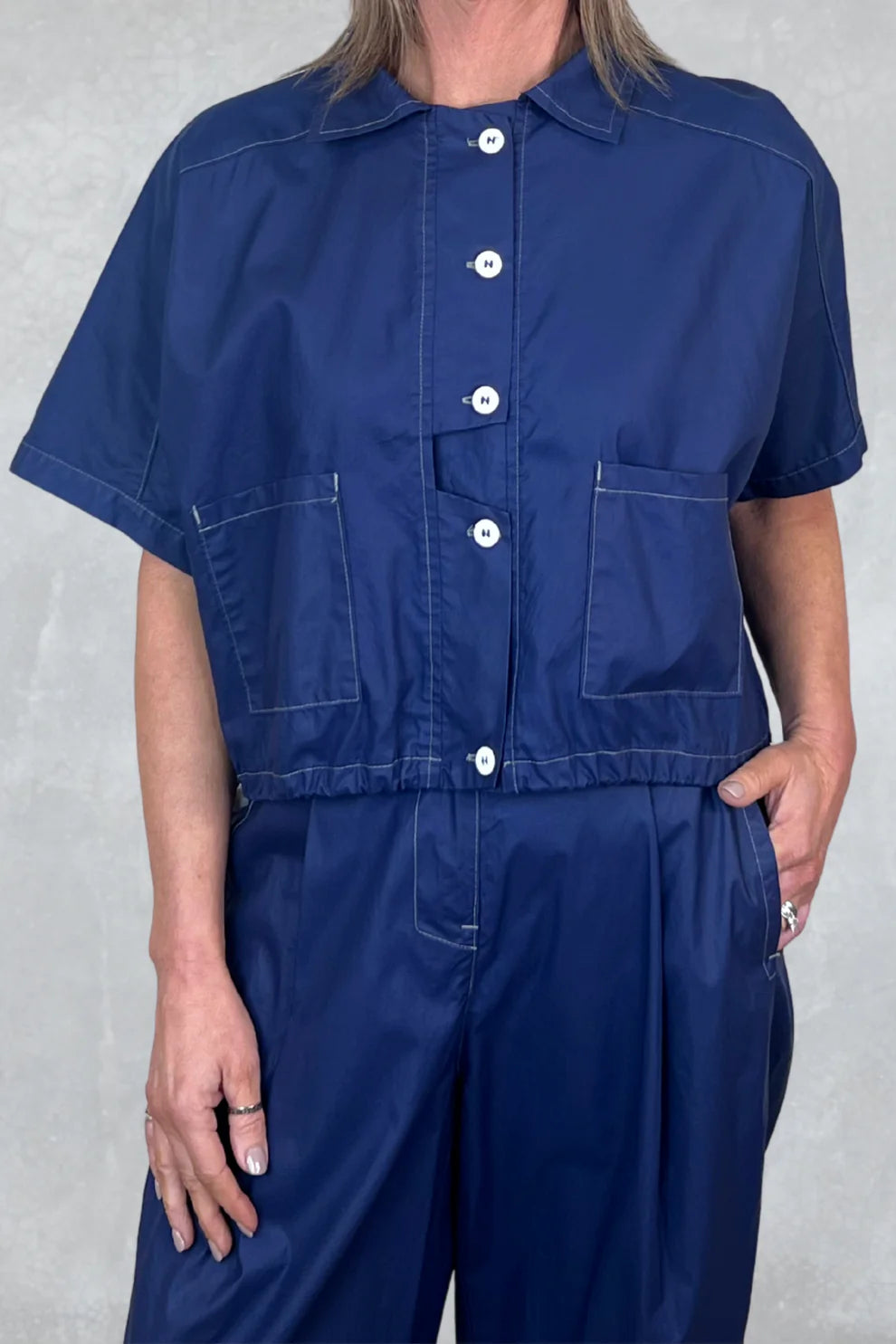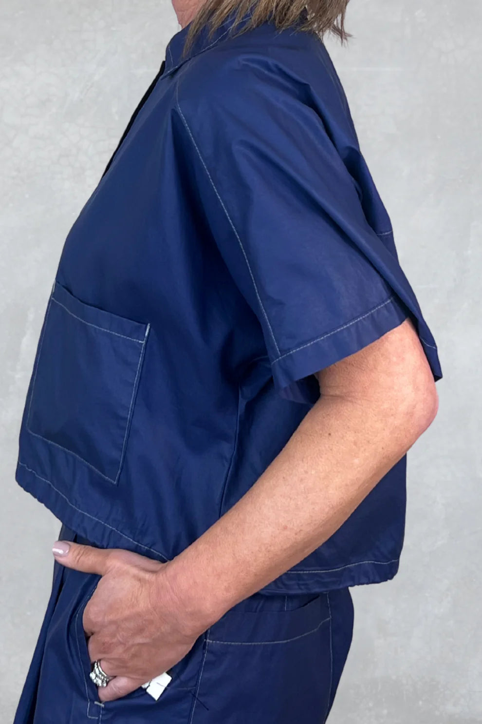 Camisa Ancha con mangas cortas estilo murciélago. Botones blancos al frente.