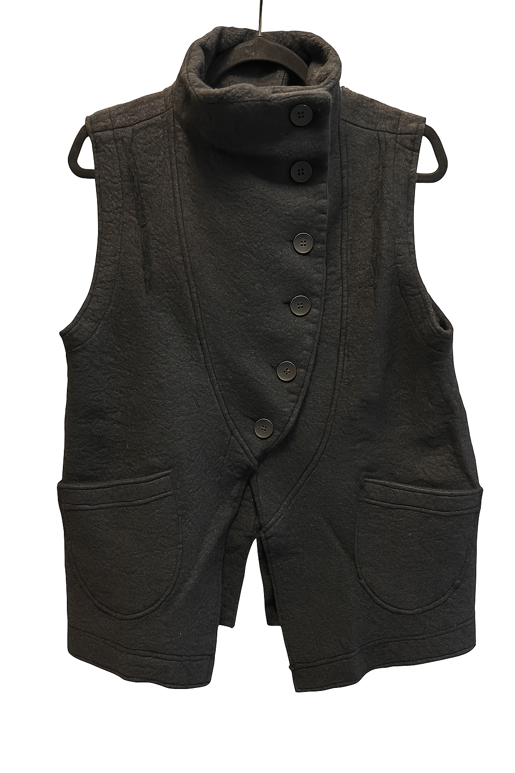 Es un chaleco negro sin mangas, confeccionado en tela gruesa de textura afelpada. Tiene un cuello alto tipo tortuga, cierre frontal con cinco botones y dos bolsillos grandes en la parte inferior. Su diseño es moderno y estructurado, ideal para combinar en atuendos casuales o de estilo urbano.