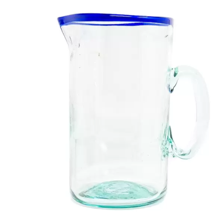 Funcionalidad, color y diseño artesanal en una sola pieza. Esta jarra de vidrio soplado se distingue por su cuerpo robusto, el asa maciza y una elegante franja azul, dando un toque vibrante y contemporáneo. Ideal para agua, jugos, limonadas o cócteles, su vertedor frontal facilita el servicio sin derrames.
