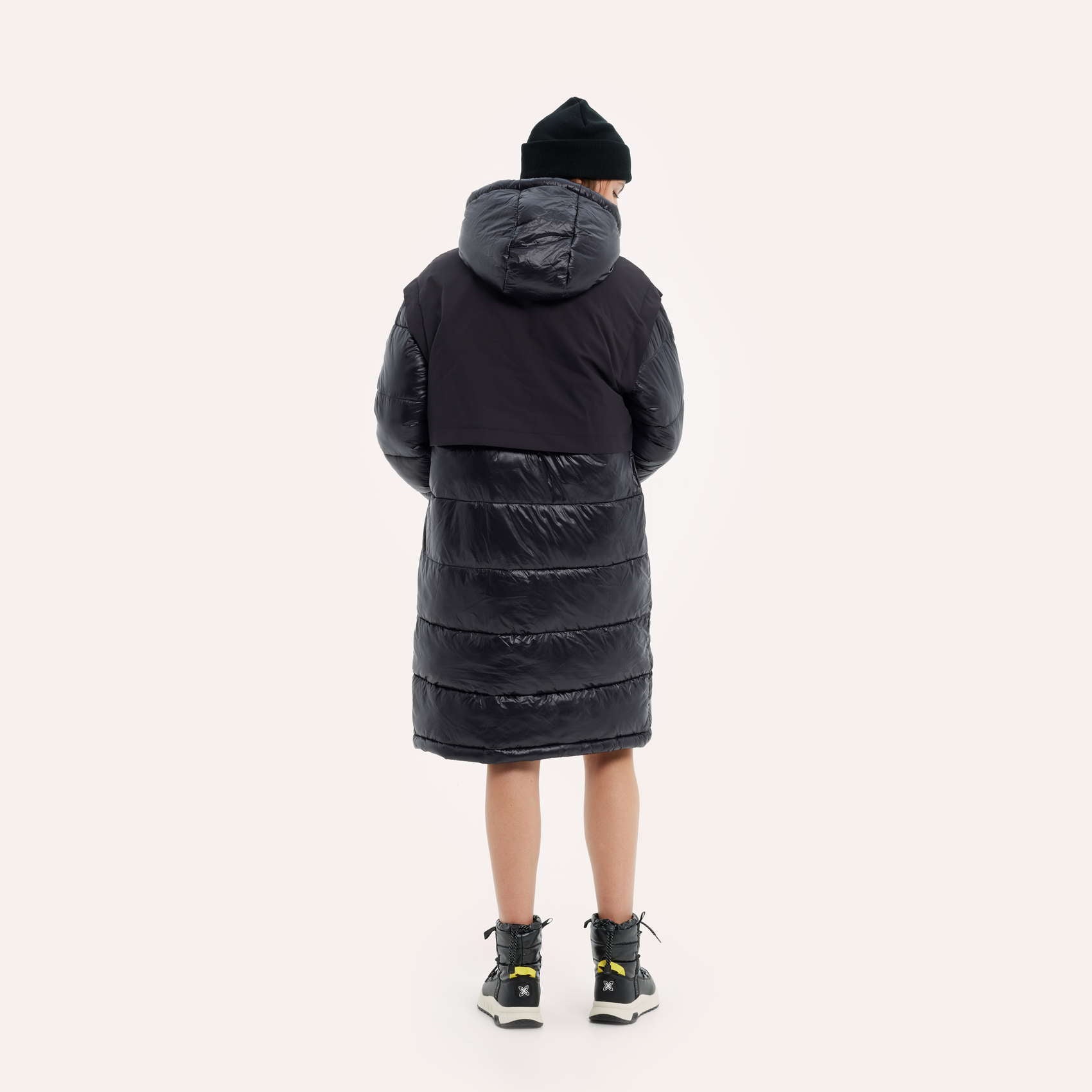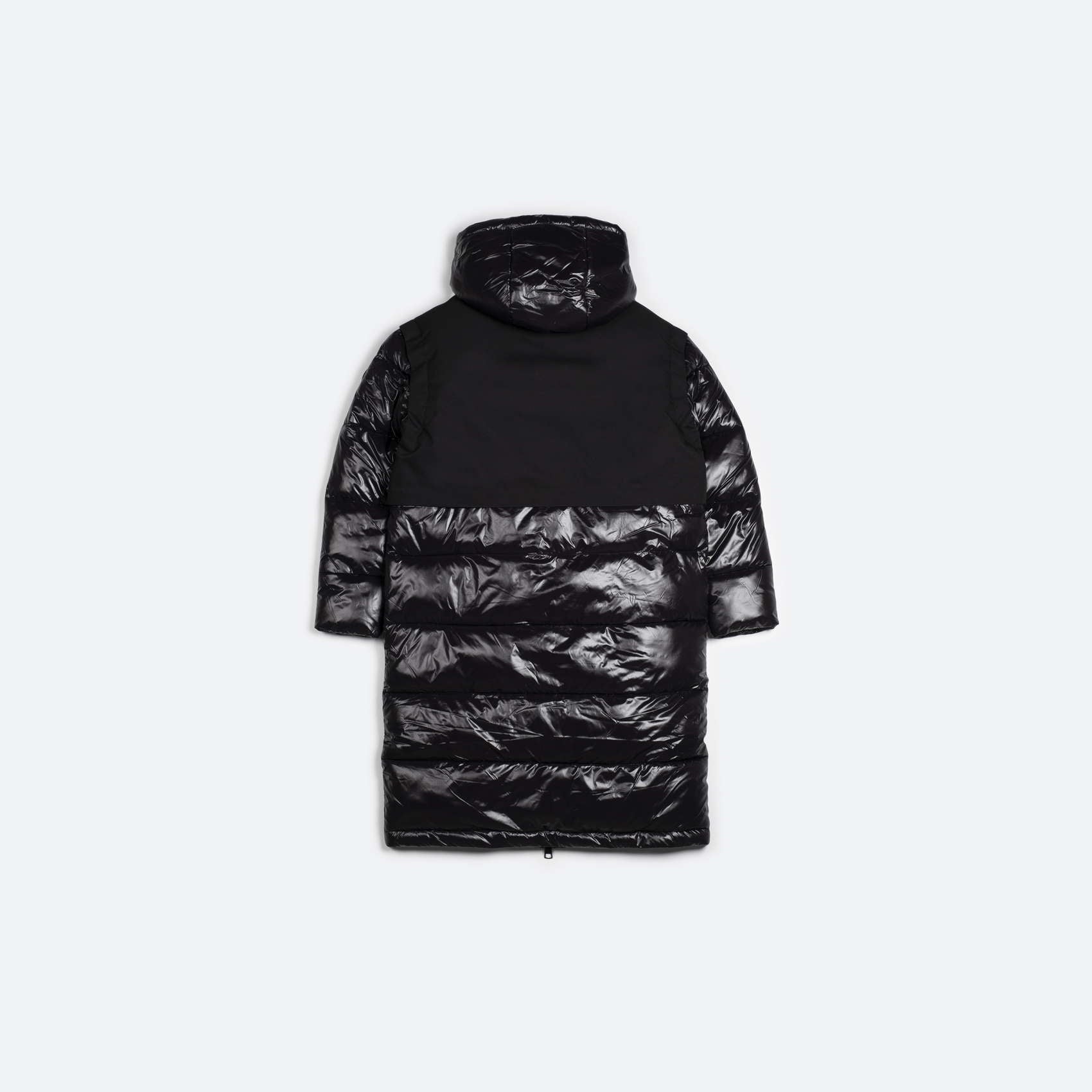 Abrigo largo acolchado resistente al agua, con capucha, fornituras a contraste y doble tejido a modo de chaleco para crear un sutil juego de texturas que le aporta un toque de modernidad. Las mangas con puño interno en canalé garantizan un comodo ajuste y la goma elástica con stoppers en cintura permiten ceñir el abrigo para poder crear un efecto más entallado. El relleno de poliester reciclado refleja nuestro compromiso con la sostenibilidad.