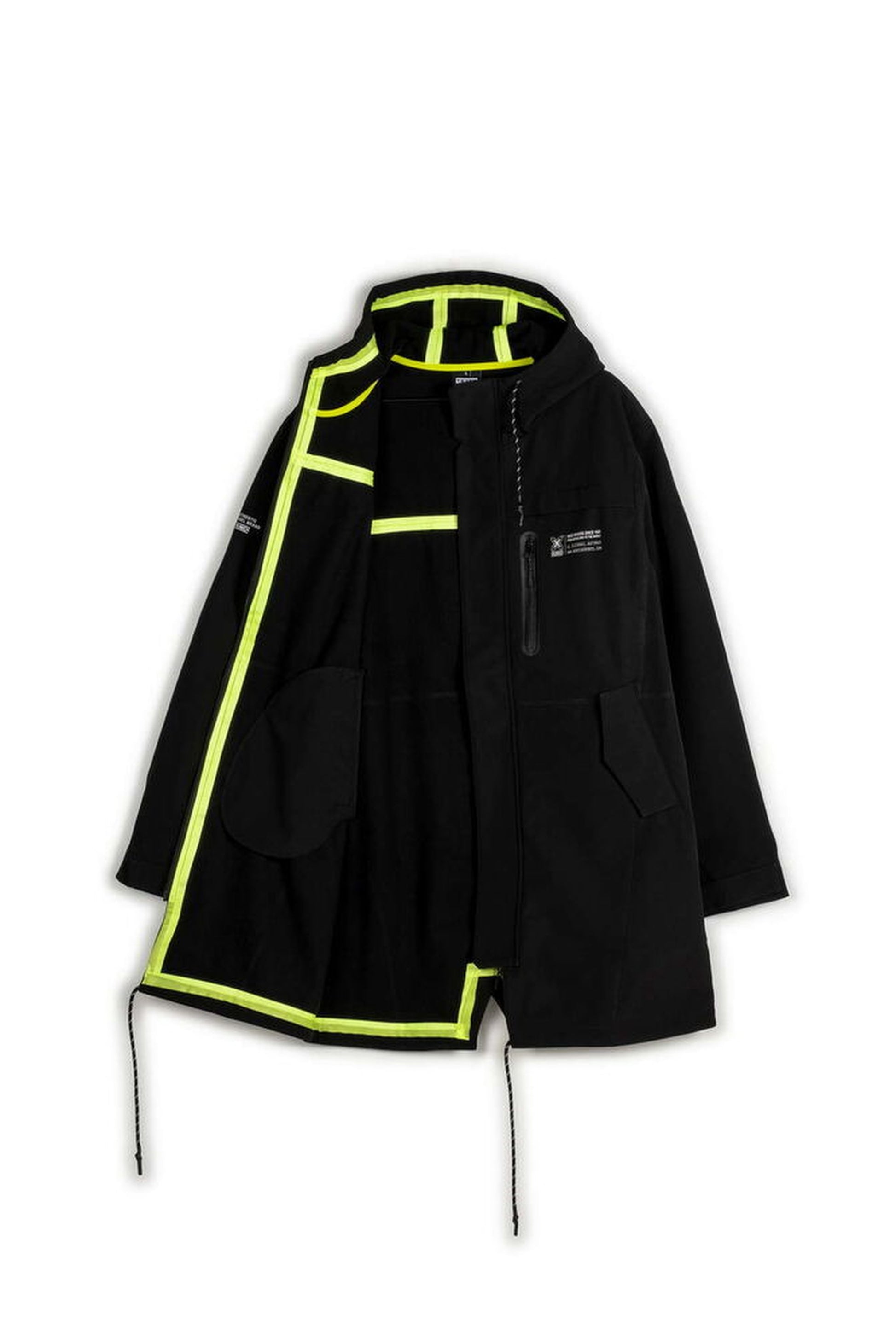 Cortavientos con capucha y bolsillo tipo canguro de estilo oversize, con tejido de nylon muy ligero y cordones outdoor para dar el detalle técnico.