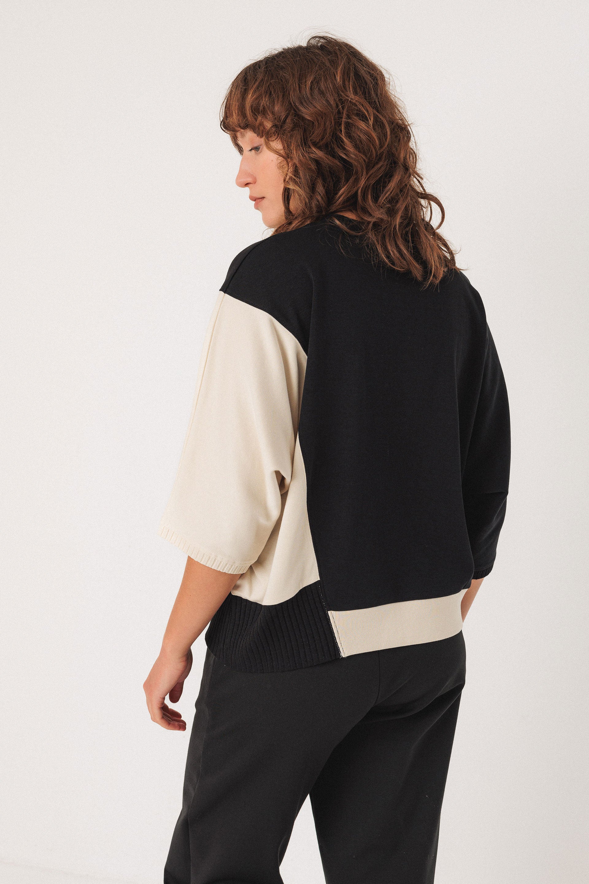 Camiseta amplia de manga murciélago con corte asimétrico, partes en contraste y remates de canalé.