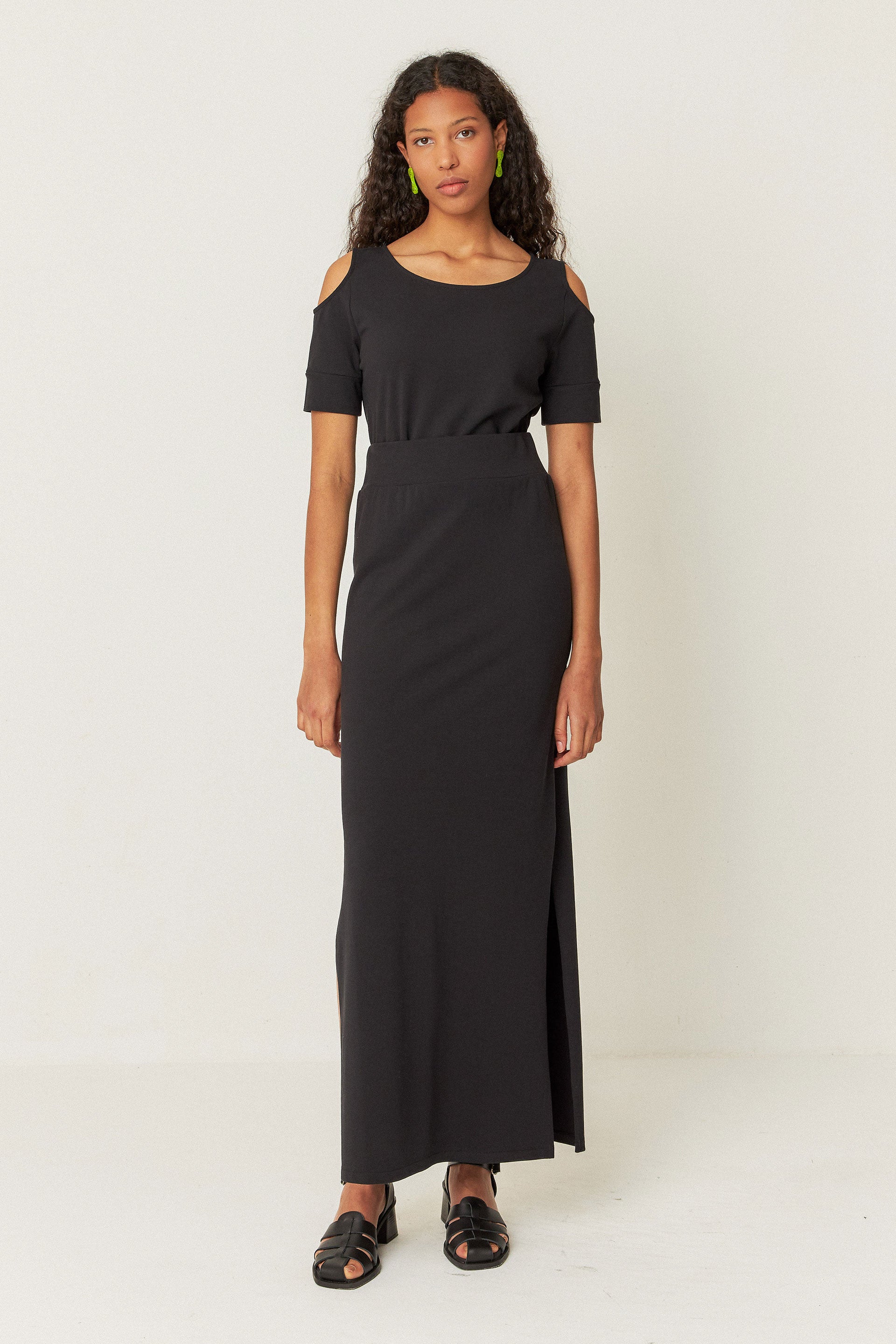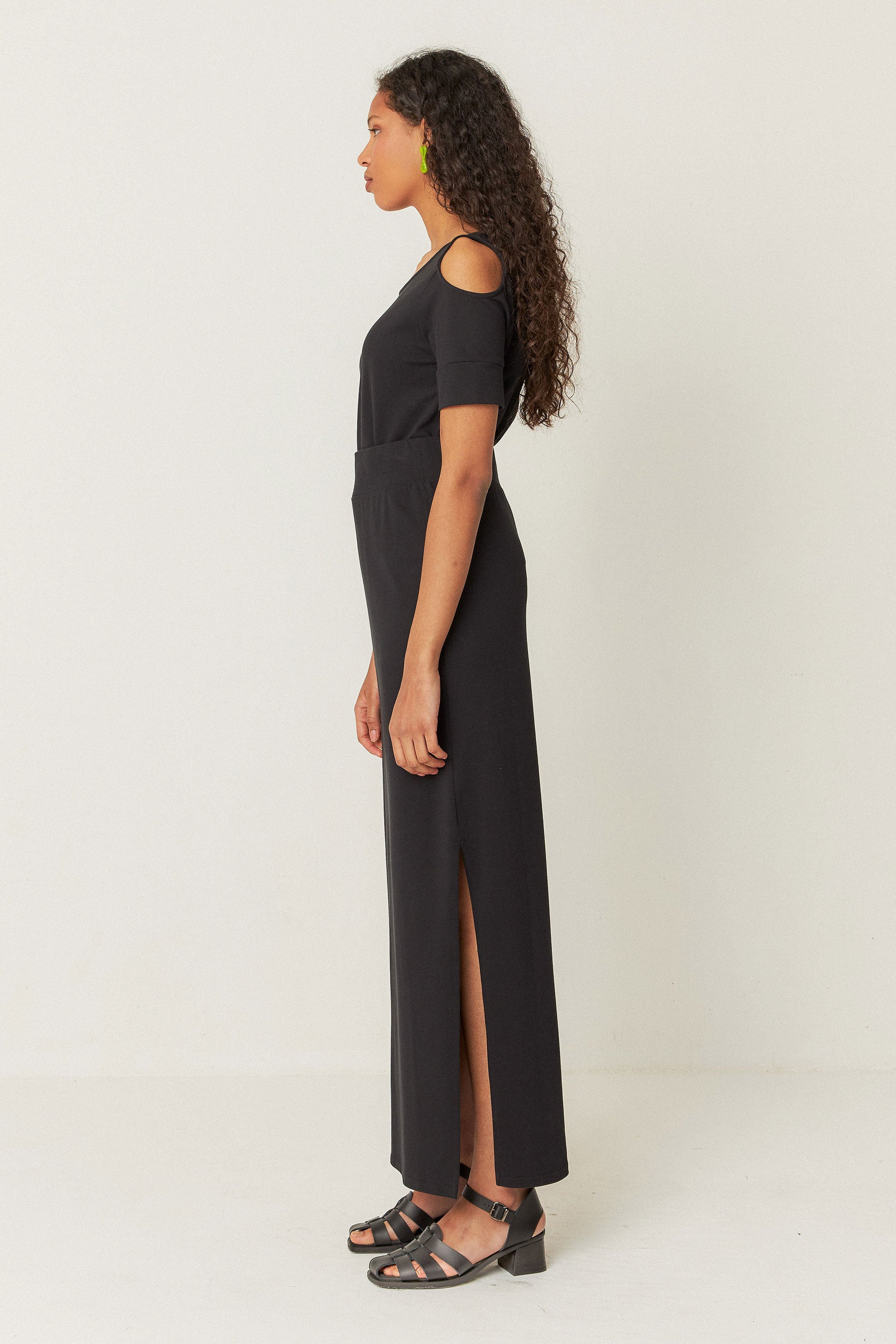Falda larga recta con la cintura elástica y aberturas laterales.