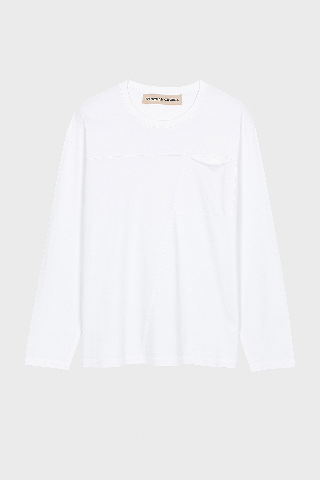 Remera unisex de manga larga en algodón suave, con cuello redondo y corte relajado. Presenta costuras decorativas en el frente y un bolsillo aplicado en el pecho, aportando un detalle moderno y minimalista. Ideal para un look casual y versátil.
