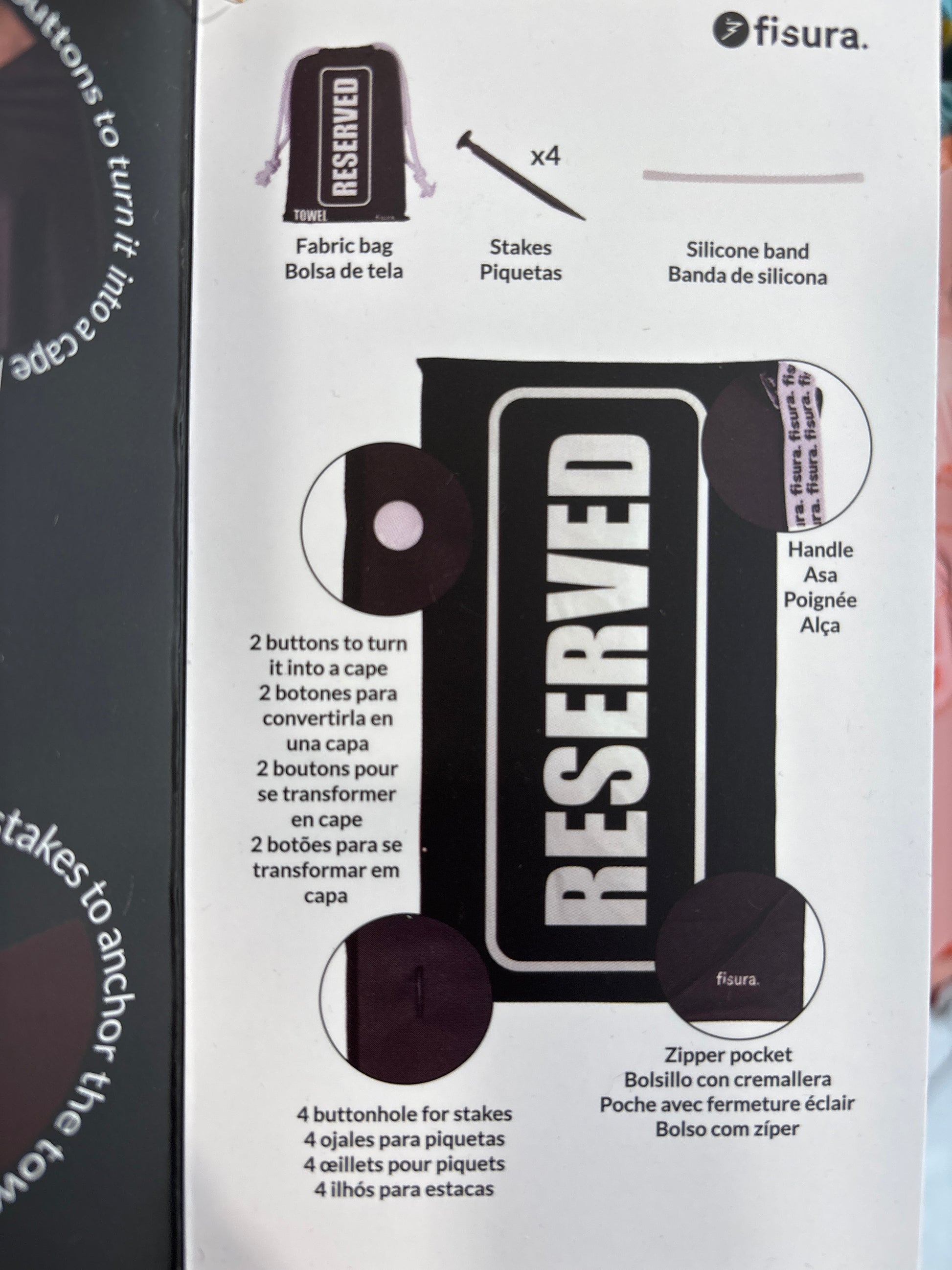 Esta toalla de microfibra tiene de todo, se convierte en capa, tiene una banda de silicona para sujetar la silla al asiento, viene con 4 piquetas para anclar la toalla y ¡Hasta un bolsillo con cremallera! luego la pliegas y la guardas en su bolsita monísima y ya tienes el kit ideal.