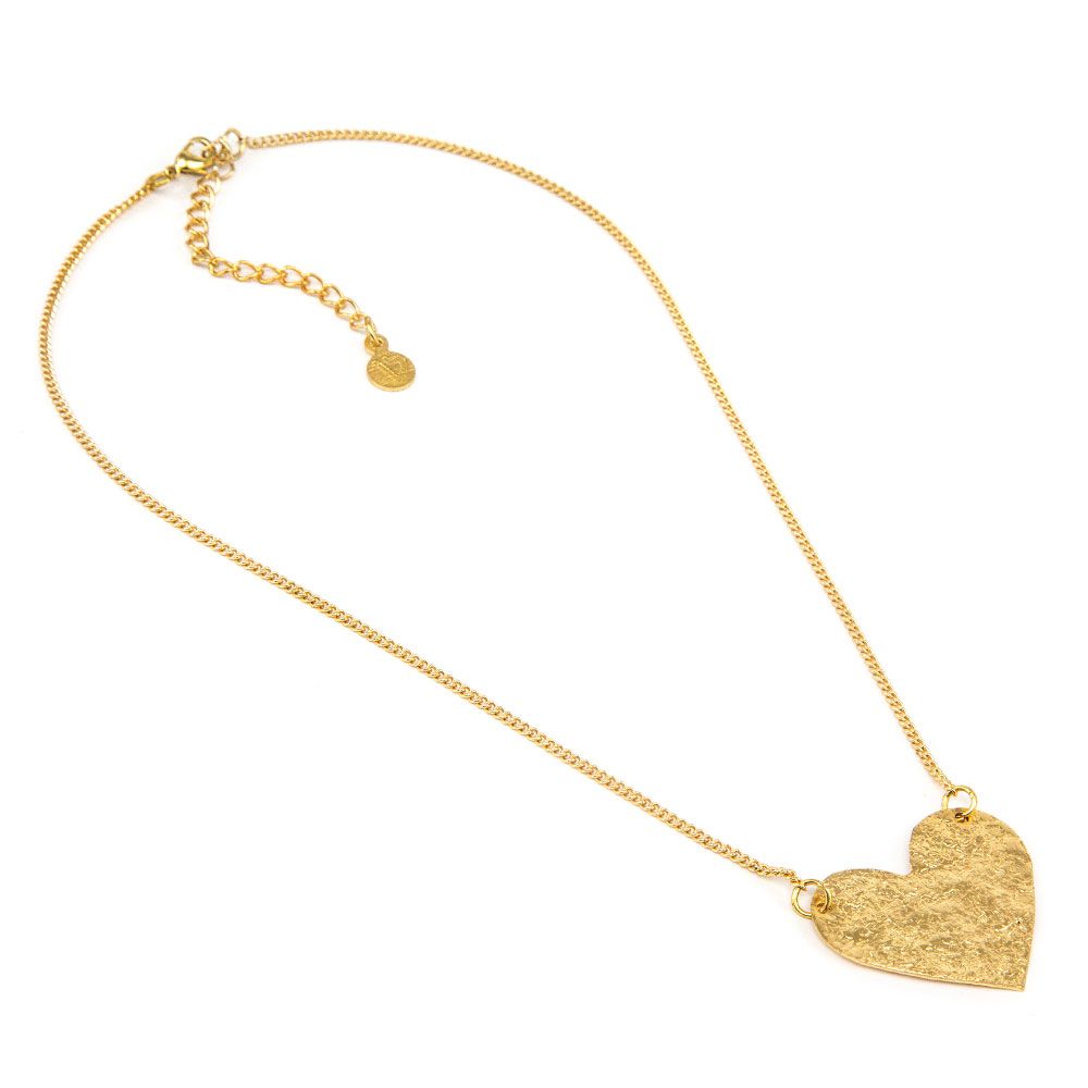 Collar de latón con colgante de corazón plano y rugoso. Cierre con mosquetón. Producto sometido a pruebas de níquel. Fabricación artesanal.