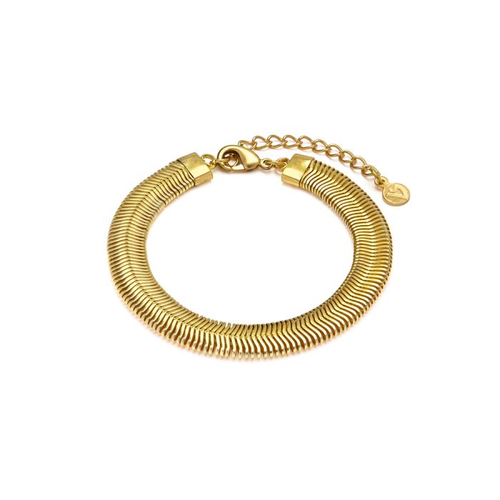 Pulsera de serpiente plana de latón. Modelo regulable. Cierre con mosquetón. Crea tu propia mezcla de pulseras combinando diferentes modelos, ligeros y cómodos de llevar. Longitud de la cadena: 18 cm. Longitud de la cadena extra: 5 cm. Producto sometido a pruebas de níquel. Joyas hechas a mano, únicas y artesanales, perfectas para todos tus looks o como idea para regalar.