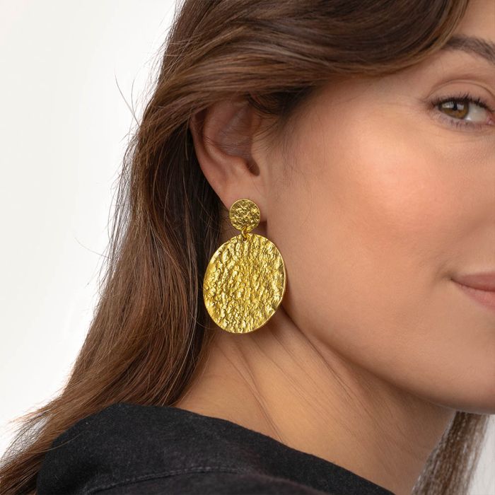Pendientes de latón con círculos planos con efecto batido. Cierre de mariposa. Tamaño: 4 cm. Producto sometido a pruebas de níquel. Fabricación artesanal.