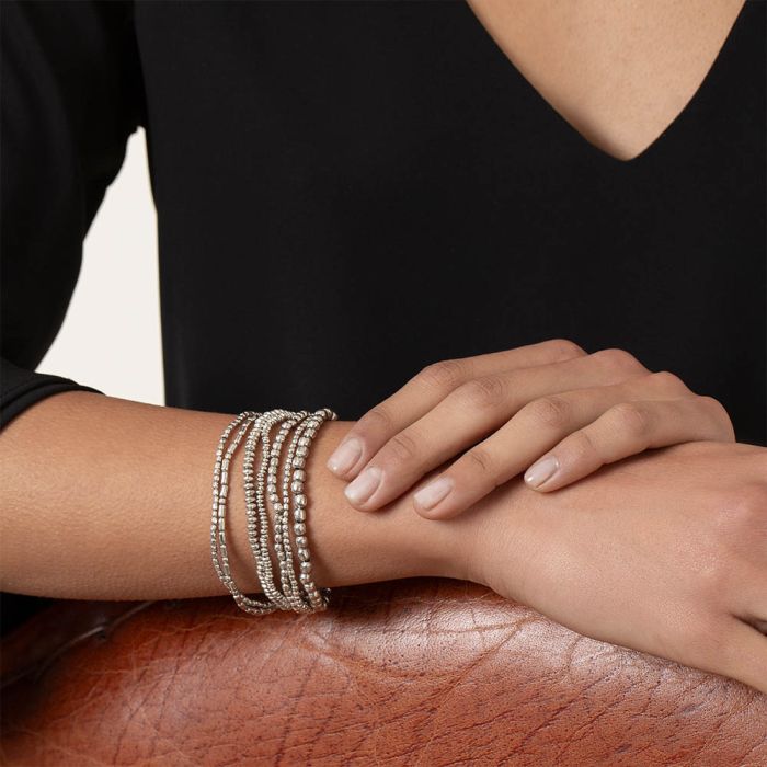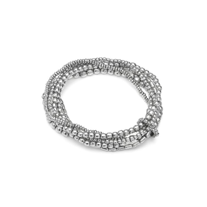 Pulsera elástica de seis vueltas formadas por elementos diferentes. Fabricación artesanal.
