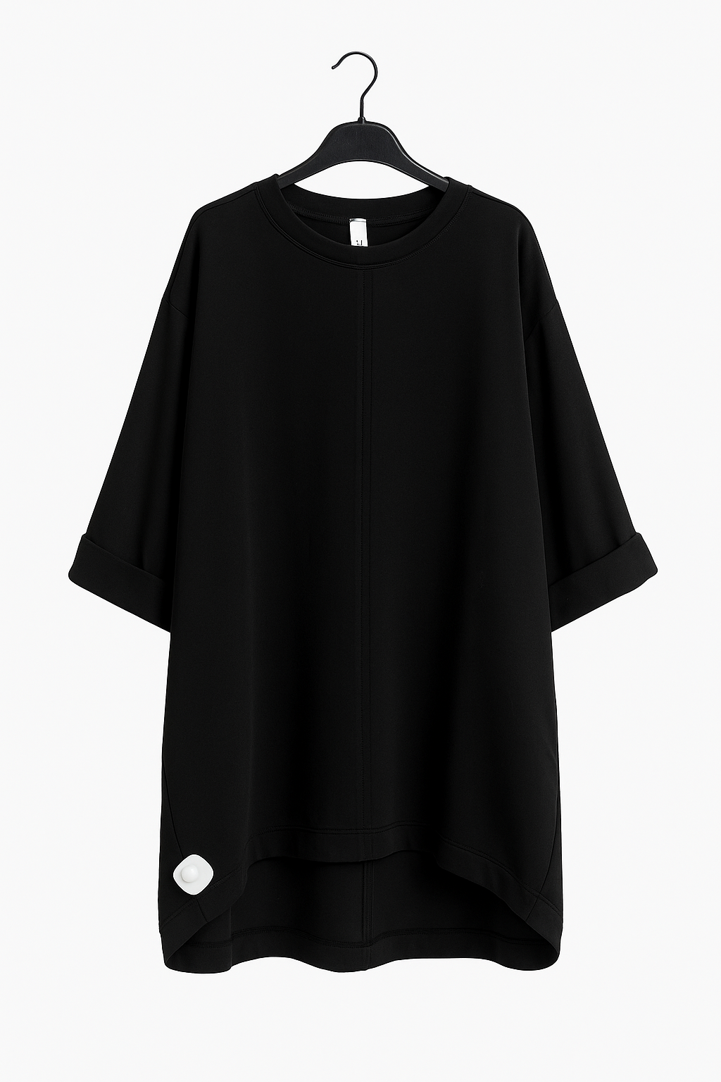 Camiseta oversize de corte amplio con mangas 3/4 y detalle de doblez. Confeccionada en tejido suave y pesado, ideal para un look cómodo y versátil. El diseño asimétrico en el ruedo aporta movimiento y un estilo moderno para combinar fácilmente.