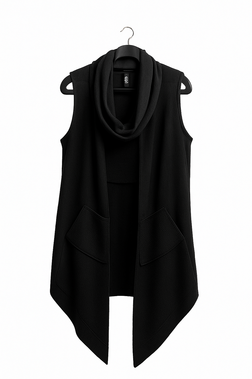 Chaleco largo sin mangas con cuello drapeado y bolsillos delanteros amplios. Su diseño abierto y fluido lo convierte en una prenda versátil, ideal para superponer sobre distintos looks y sumar estilo con comodidad.