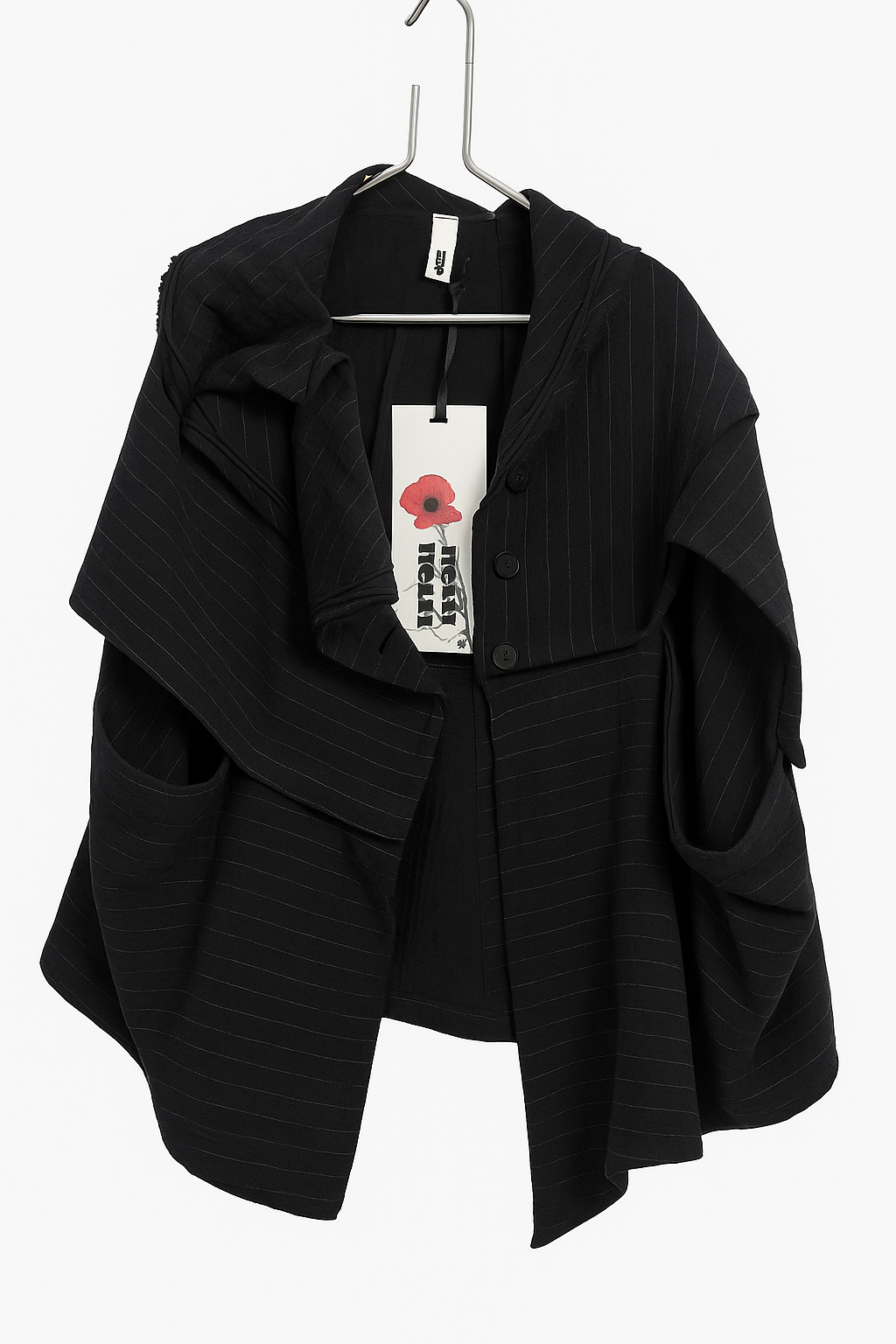 Chaleco negro oversize con diseño irregular y textura rayada. Presenta solapas amplias, bolsillos laterales y botones frontales. Una prenda versátil y con estilo único para elevar cualquier look.