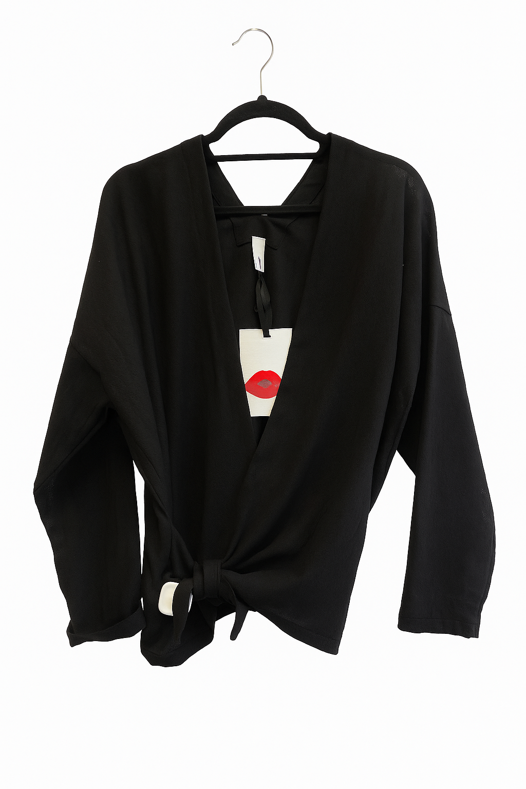 Blusa negra de manga larga con diseño cruzado al frente y nudo ajustable en la cintura. Confeccionada en tela ligera y fluida, ideal para un look casual o elegante.