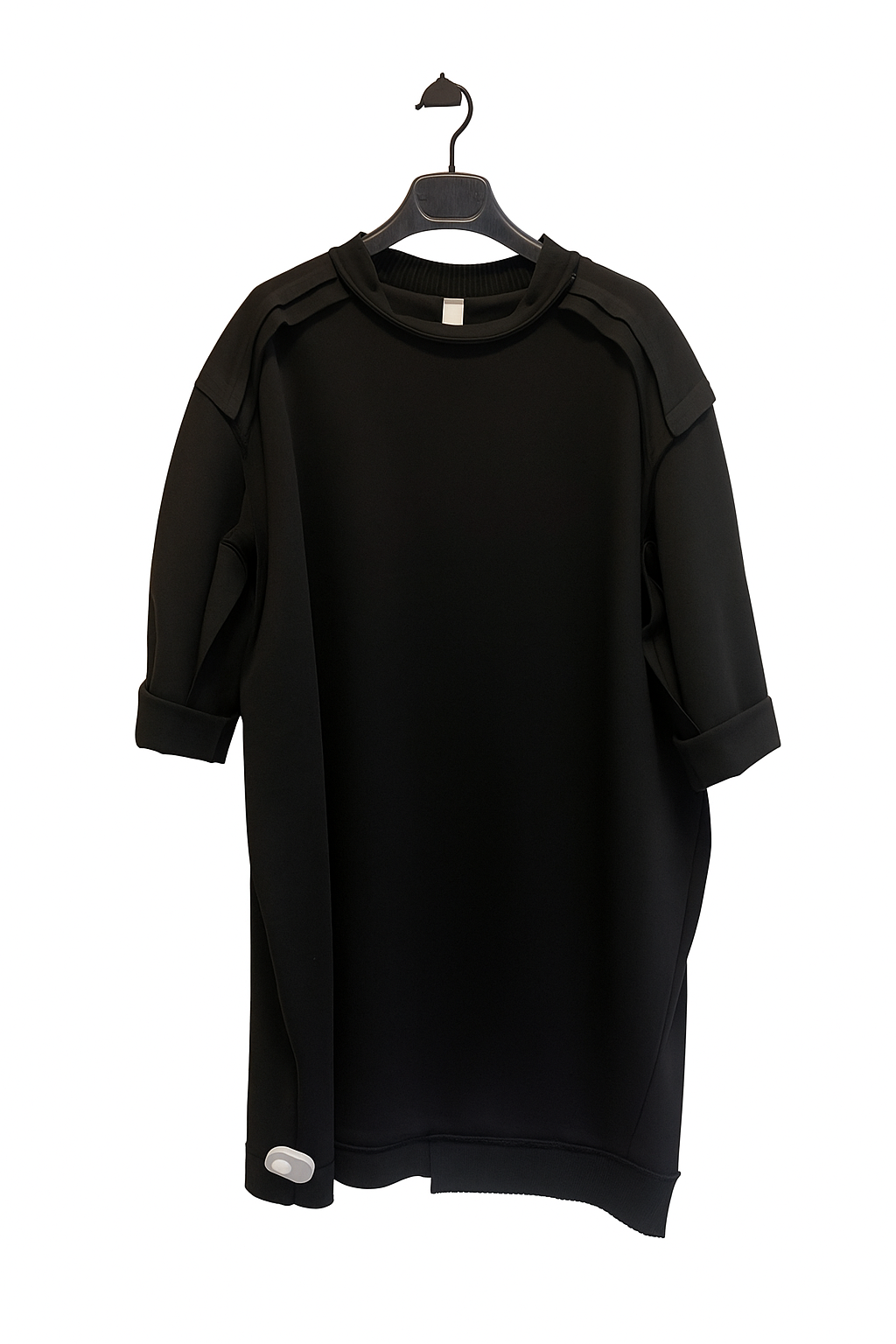 Vestido oversize negro de estilo urbano, confeccionado en tejido cómodo y ligero. Presenta mangas a media longitud con dobladillo, cuello redondo y detalles estructurados en los hombros que aportan un toque moderno. Ideal para un look casual y versátil.