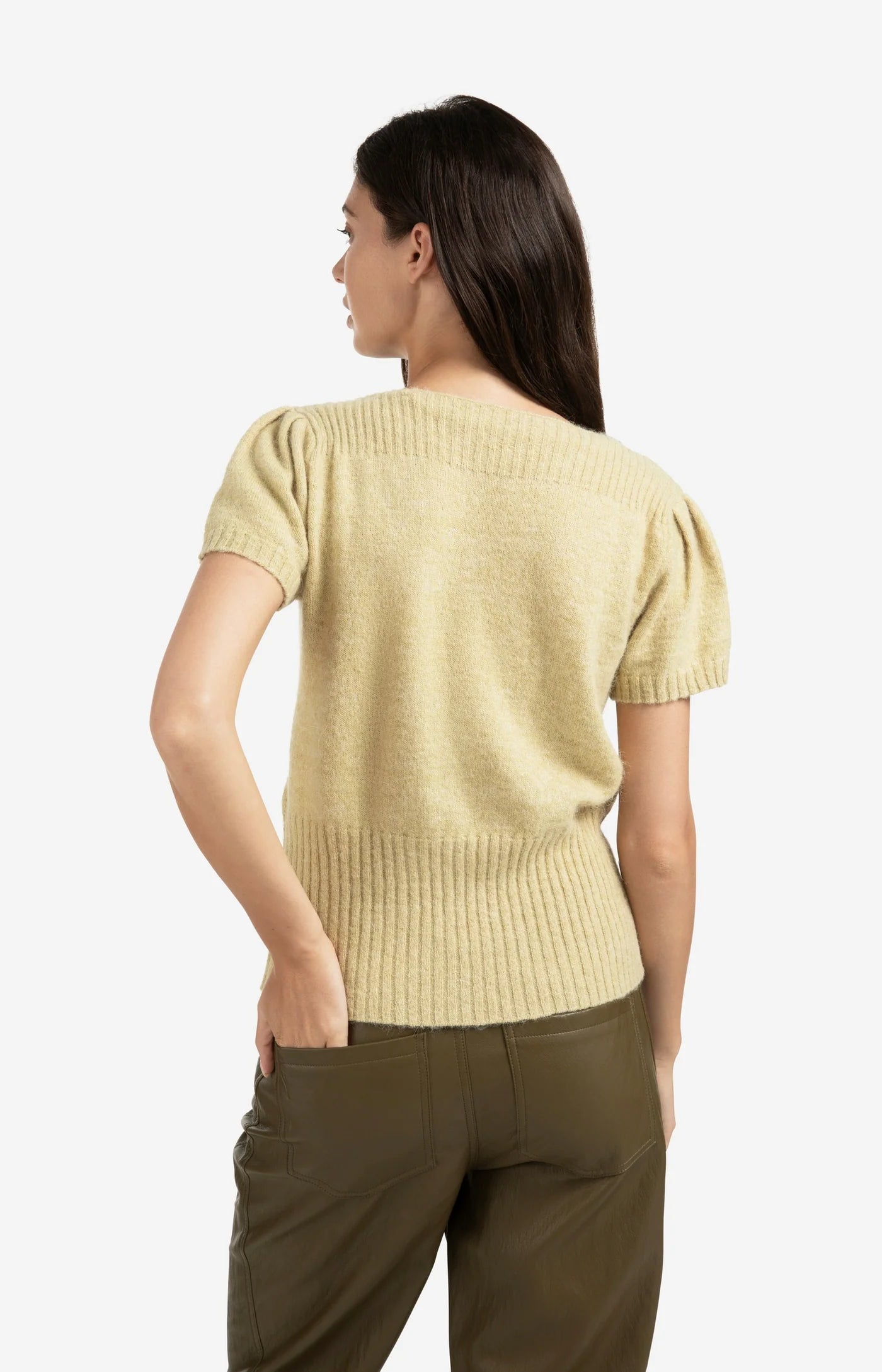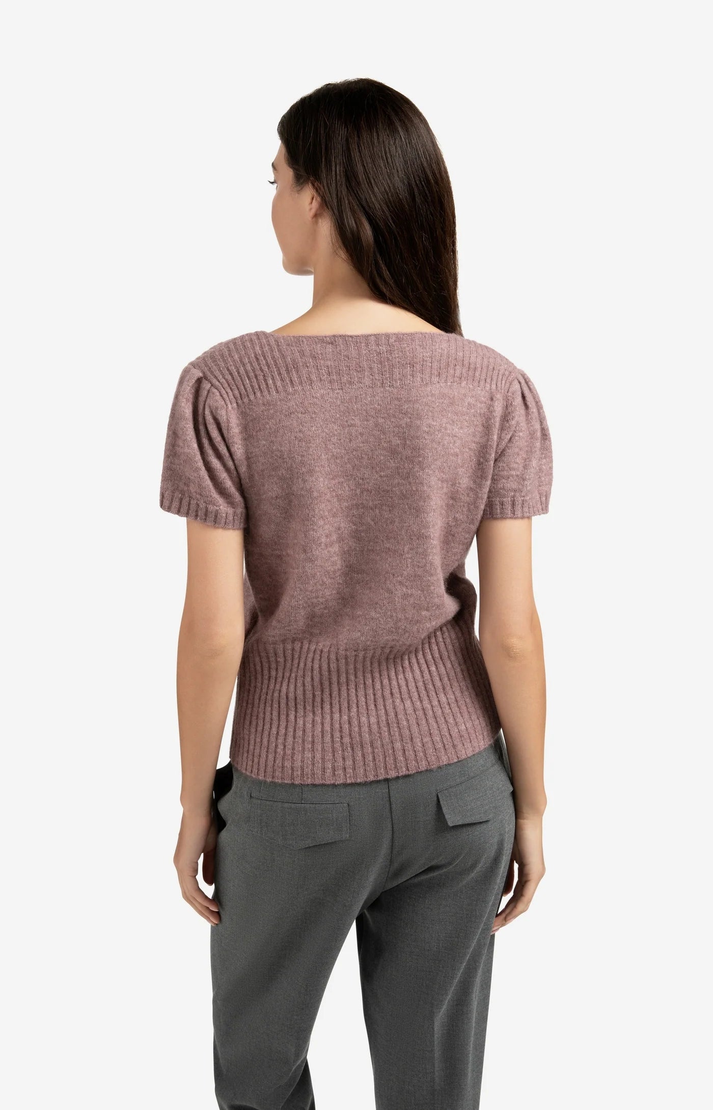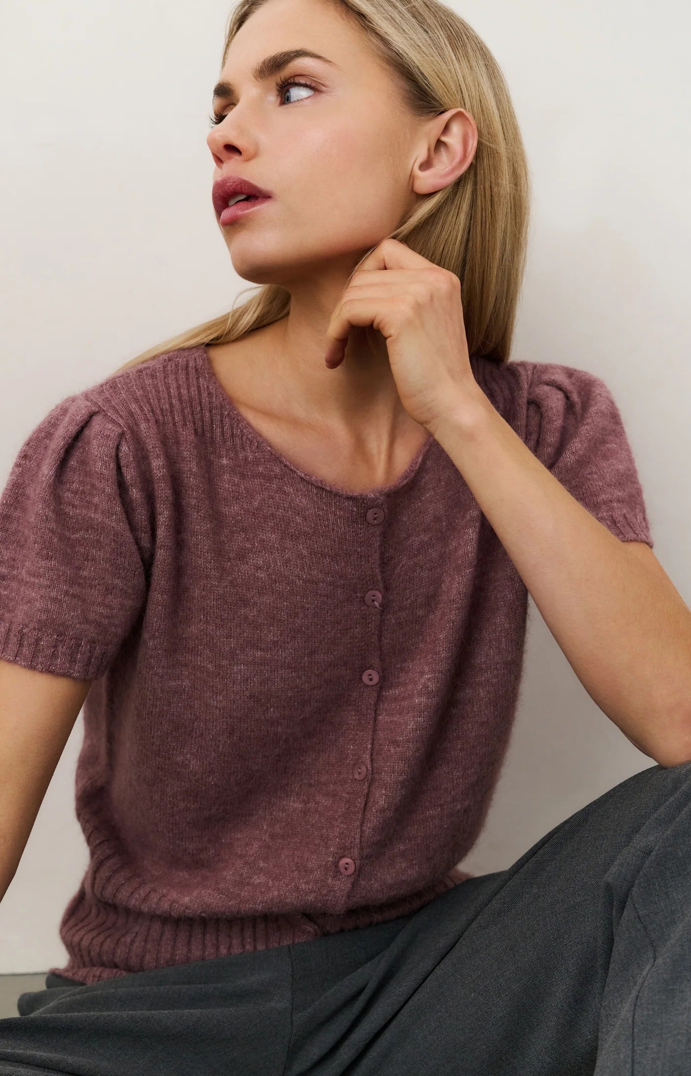 Este cárdigan de punto suave presenta mangas cortas con sutiles pliegues en los hombros para un toque femenino. Diseñado con cuello redondo y corte ajustado, está rematado con delicados detalles de canalé en las mangas, el bajo y los hombros. El cierre frontal con botones le aporta un aire clásico.